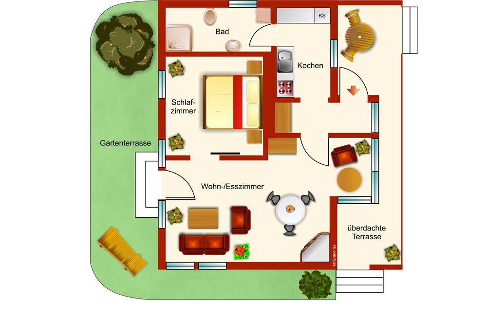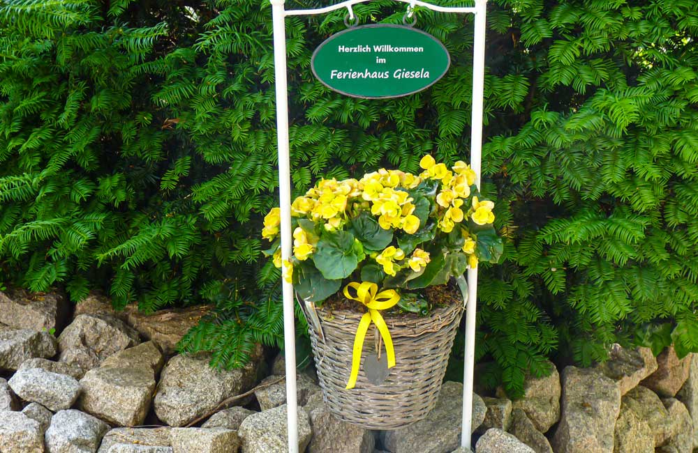 Das Ferienhaus Giesela steht auf einem separaten Gartengrundstück (800 qm), neben dem Haus des Vermieters. Das Ferienhaus besitzt eine eigene Zufahrt mit Parkplatz.