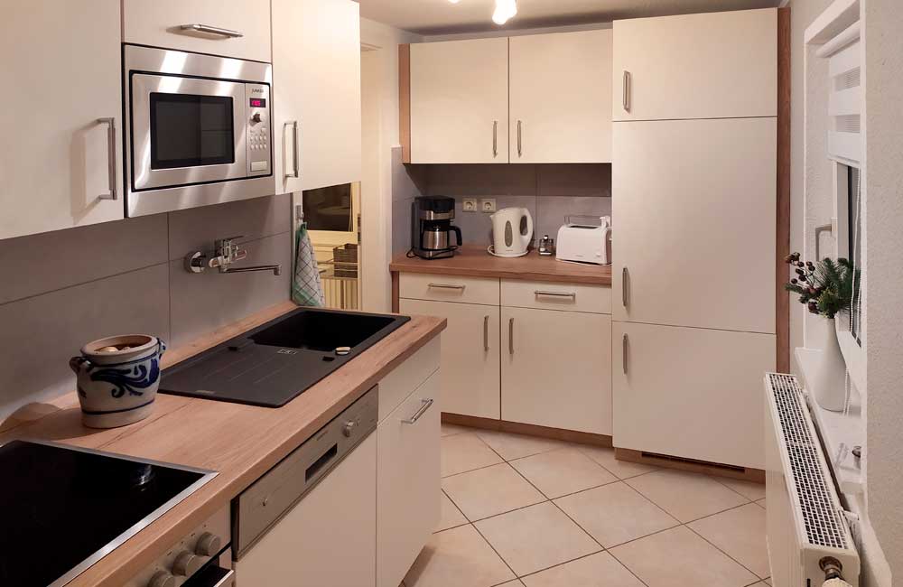 Essen / Trinken: Kühlschrank, E-Herd, Mikrowelle, Toaster, Kaffeemaschine, Wasserkocher, Geschirrspüler