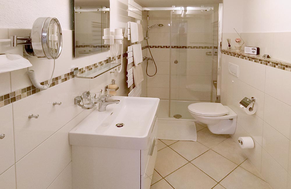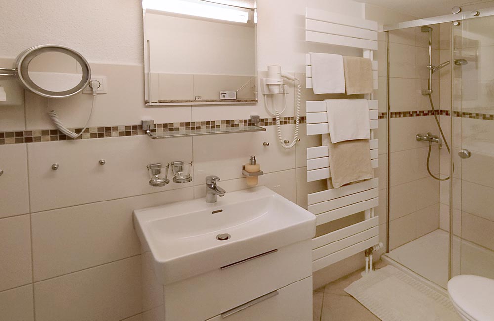 Bad: Haartrockner, beleuchteter Kosmetikspiegel, Handtücher, Kosmetiktücher